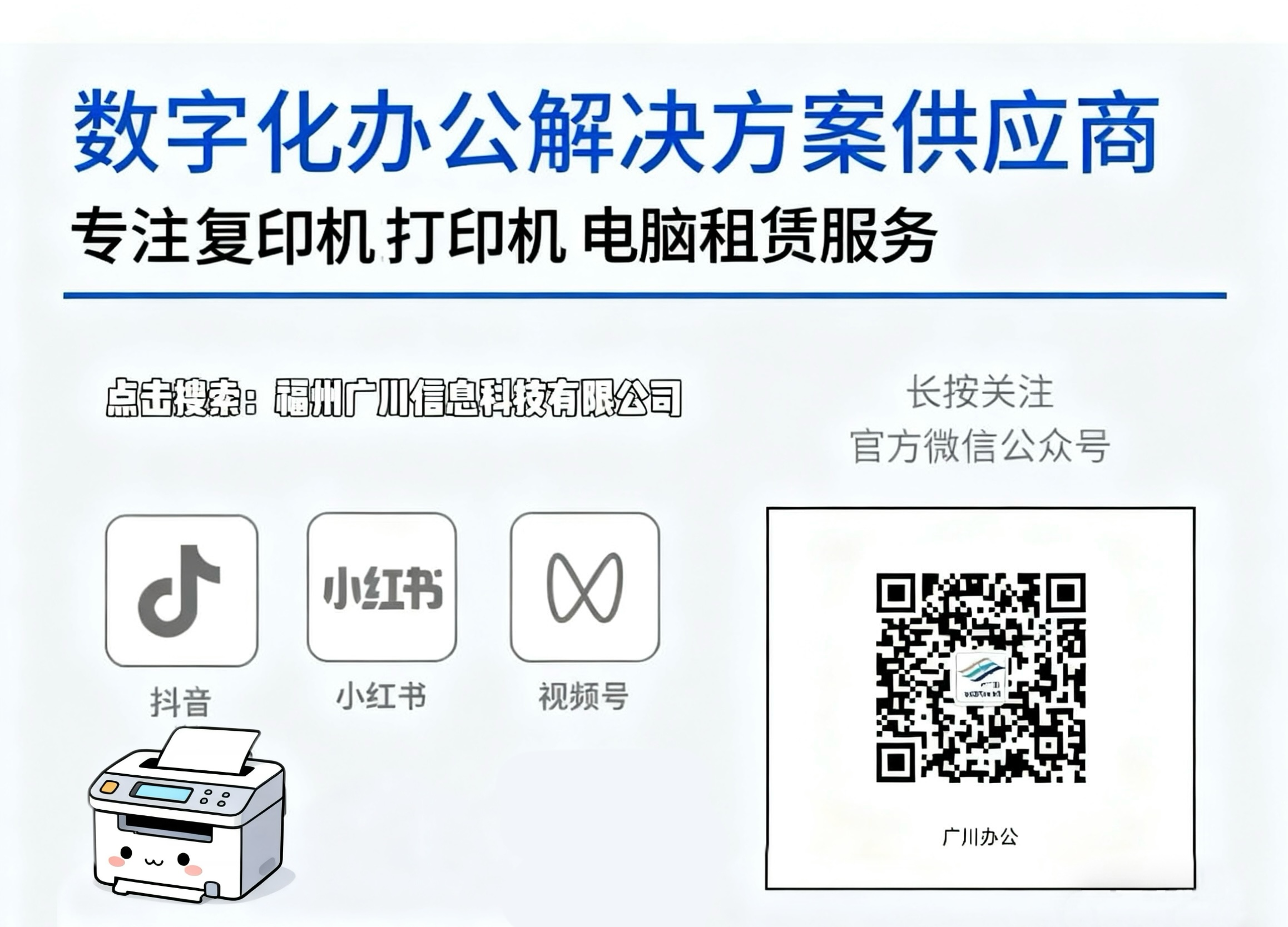 作为福州租打印机领域的实力领先服务商,福州广川办公设备租赁有限公司凭借29年行业经验,为上万家企业提供了从设备租赁到数字化管控的全流程解决方案。其优势在于: